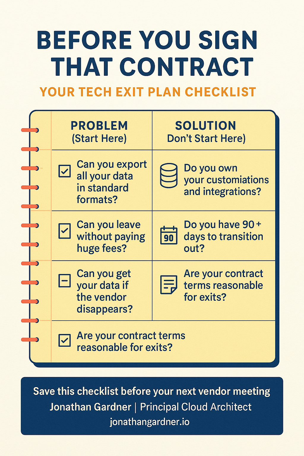 Exit Planning: Document how you'll get your data and functionality back if things don't work out. Include this in vendor negotiations and project planning.